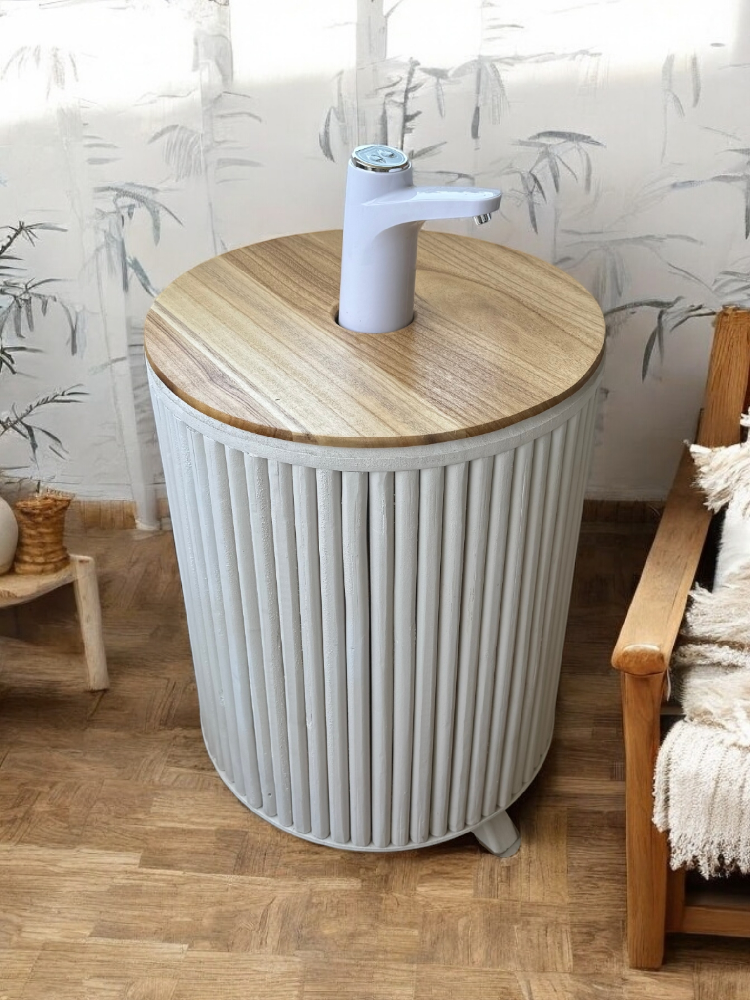 Funcionalidad y diseño se unen en nuestro Mueble para Bidón de agua Blanco con Camel, una opción personalizada que combina una base blanca con una tapa en tono camel (café claro), logrando un equilibrio perfecto entre modernidad y calidez.